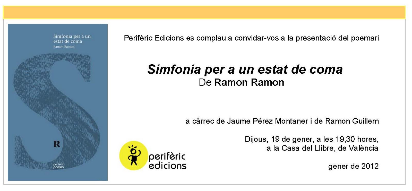 El proper dijous 19 de gener a les 19,30 hores presentarem el llibre de Ramon Ramon, Simfonia per a un estat de coma. Presentaran l’acte JaumePérez Montaner i Ramon Ramon.